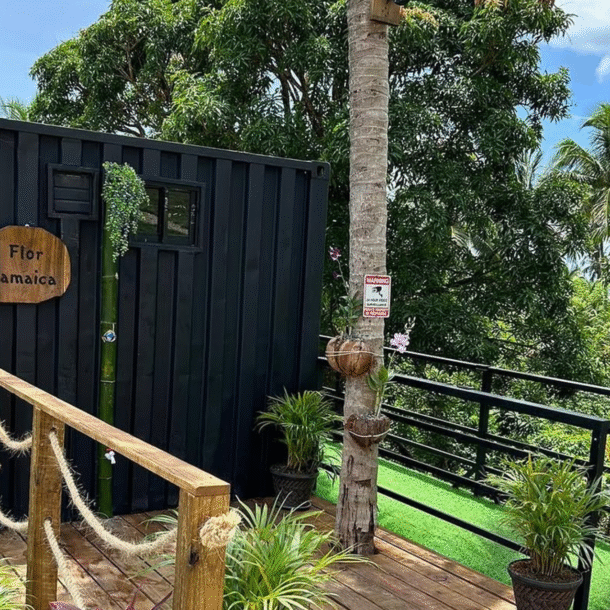 Flor Jamaica, nuestra villa-contenedor única, diseñada para una escapada romántica inolvidable. Imagina despertar con vistas panorámicas al mar, disfrutar de un café en tu terraza privada y terminar el día en tu propio jacuzzi bajo las estrellas.